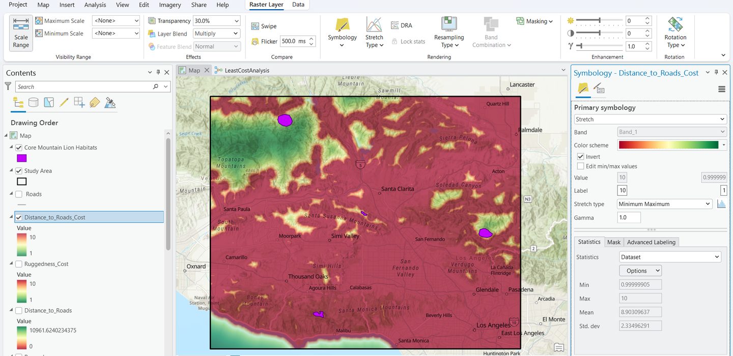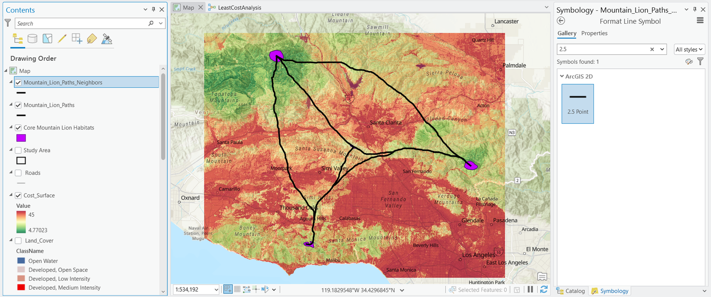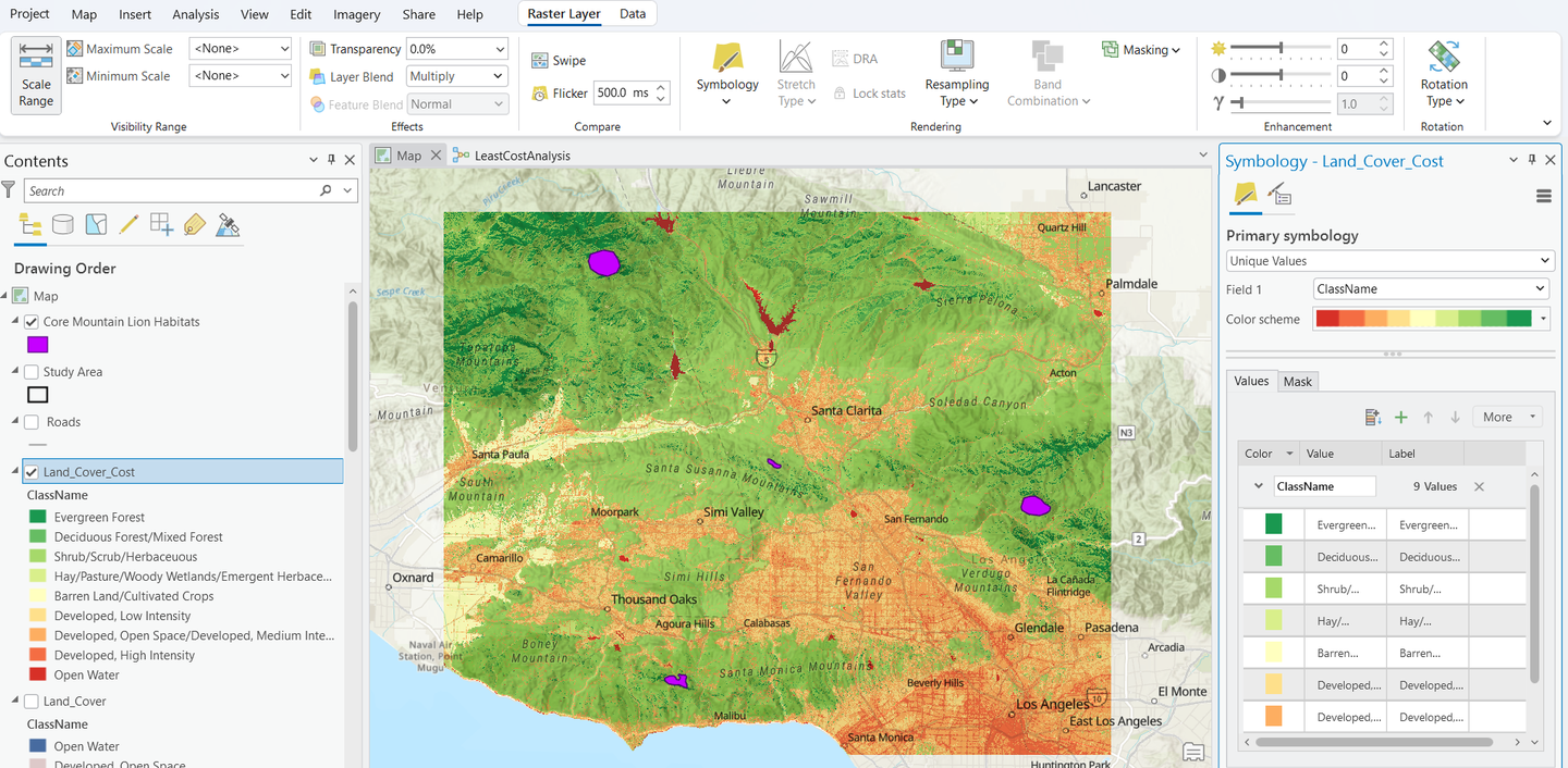 بناء نموذج ModelBuilder لتحليل وتحديد ممرات الحياة البرية لربط موائل أسود الجبال حول لوس أنجلوس
